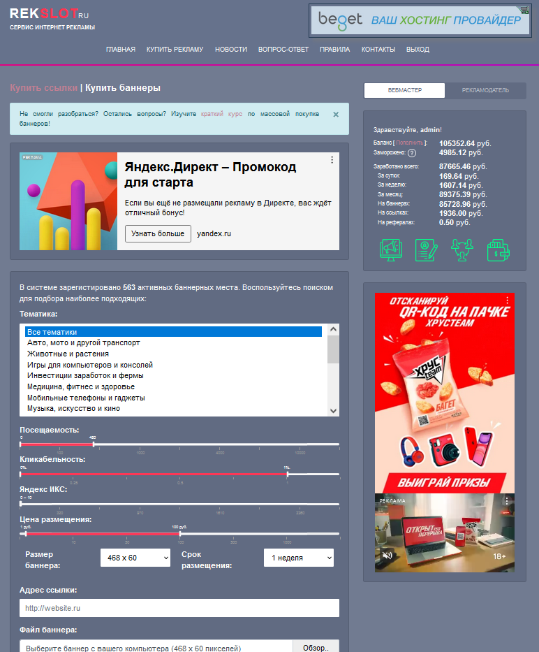 9 Срок размещения. На всех баннерных площадках системы срок размещения начинается 1 недели и не может превышать 4 недель. Этот параметр в значительной мере влияет наконечную стоимость покупки, но никак не влияет на количество найденных площадок.