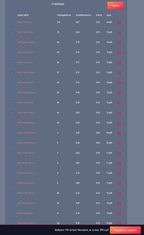 После того, как все поля заполнены и выставлены параметры, вам необходимо нажать на кнопку «Найти». Ниже появится список найденных площадок. Для удобства на странице отображается по 100 записей, под списком имеется переключатель страниц. В списке выведены основные параметры каждой витрины, ее адрес и стоимость. Если срок размещения был выбран свыше 1 недели, стоимость указывается за выбранный срок. Рекламодателю доступна одиночная покупка и множественный выбор. Чтобы совершить покупку на одной ветрине, достаточно нажать на иконку корзинки и вы попадете на страницу отображения результата и выбора способа оплаты.